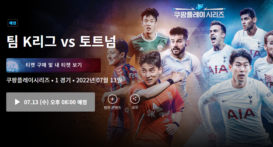 '쿠팡플레이 시리즈' 1차전 팀 K리그와 토트넘의 맞대결은 13일 오후 8시 서울월드컵경기장에서 열리며, 중계방송은 오직 쿠팡플레이에서만 시청할 수 있습니다.