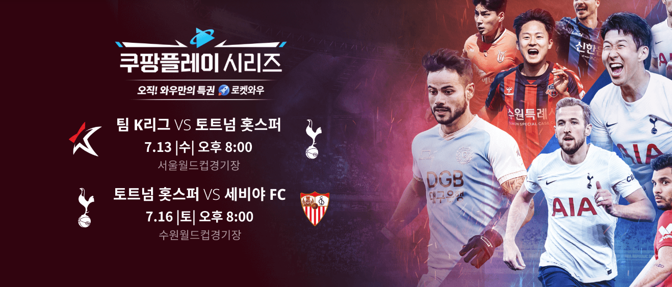 쿠팡플레이는 오는 17일 오후 3시부터 팀 K리그와 토트넘 홋스퍼가 펼치는 1차전 경기, 오는 19일 오후 3시부터 토트넘 홋스퍼와 세비야 FC가 펼치는 2차전 경기 티켓 예매를 개시합니다.