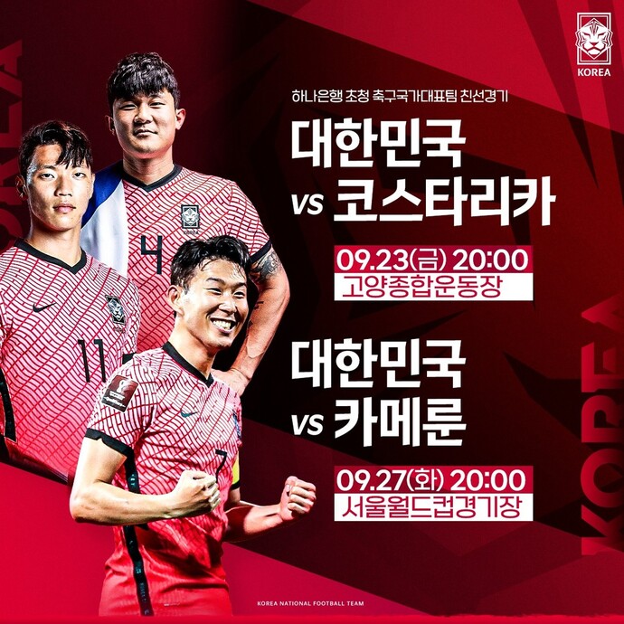 대한민국 축구 국가대표팀(피파랭킹 28위)은 23일 금요일 오후 8시 경기도 고양종합운동장에서 코스타리카(피파랭킹 34위)와, 27일 화요일 오후 8시에는 서울월드컵경기장에서 카메룬(피파랭킹 38위)과 맞붙는입니다. 코스타리카와 카메룬은 모두 카타르 월드컵 본선 진출국입니다.